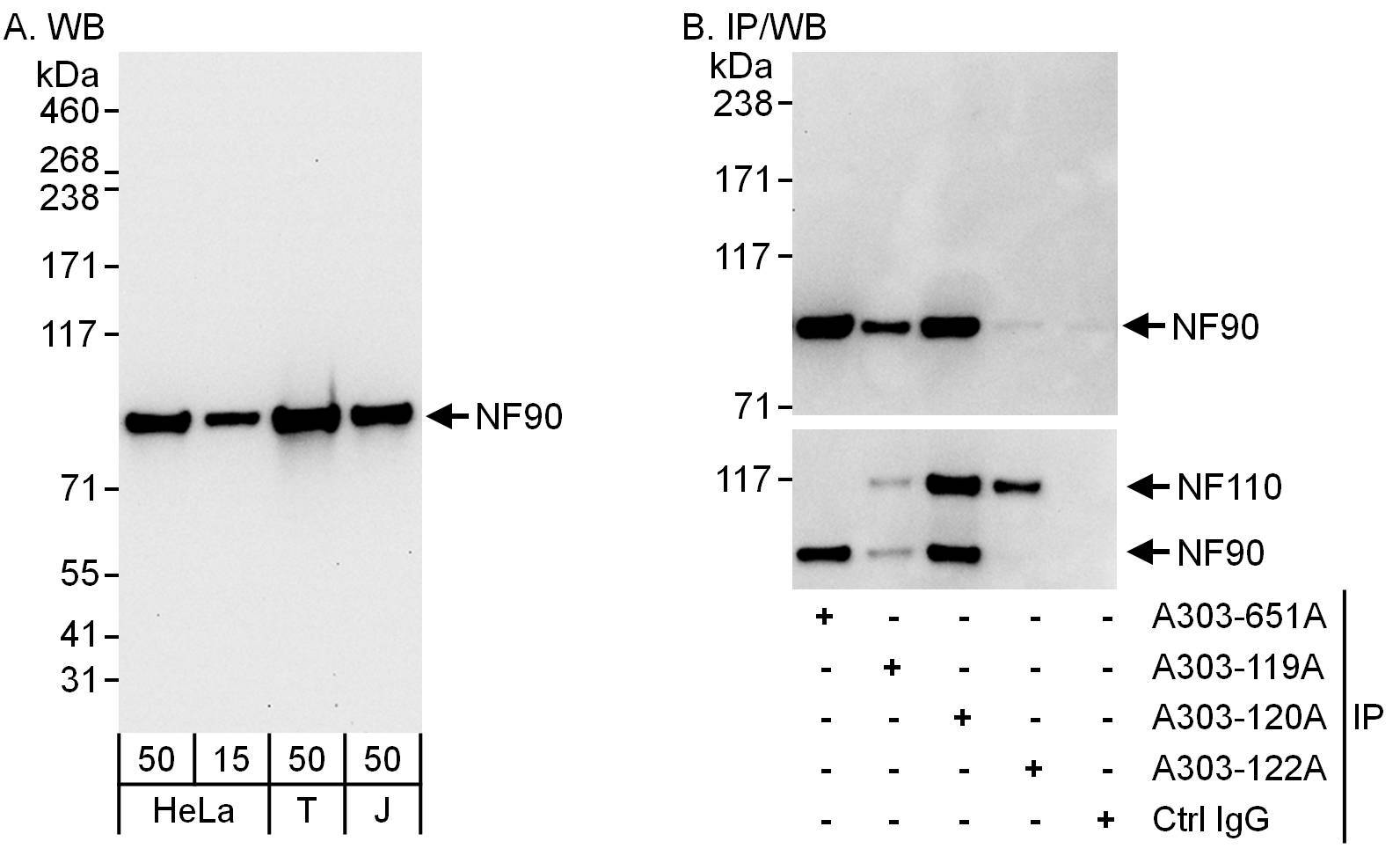 Immunogen: synthetic peptide. The epitope recognized by A303-651A-T maps to a region between residue 652 and 702 of human Nuclear Factor of Activated T-cells, 90 kD using the numbering given in entry NP_004507.2 (GeneID 3609).