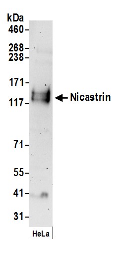 | Immunogen: | synthetic peptide. The epitope recognized by A304-464A-T maps to a region between residue 659 to 709 of human Nicastrin using the numbering given in entry NP_056146.1 (GeneID 23385). |