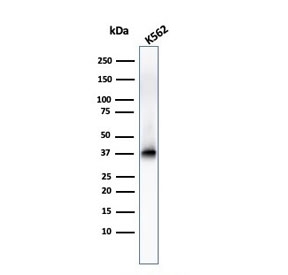 0.2 mg/ml in 1X PBS with 0.1 mg/ml BSA (US sourced) and 0.05% sodium azide. Recognizes a 33kDa glycoprotein, identified as Nucleophosmin (NPM). It is predominantly localized in the nucleus of cells in most tissues. NPM is involved in ribosomal assembly and rRNA transport. It is an abundant protein that is highly phosphorylated by Cdc2 kinase during mitosis. This phosphoprotein moves between the nucleus and the cytoplasm. It is thought to be involved in several processes including regulation of the ARF/p53 pathway. A number of genes are fusion partners, in particular the anaplastic lymphoma kinase gene on chromosome 2. Mutations in exon 12 affecting the C-terminus of the protein are associated with an aberrant cytoplasmic location. Mutations in this gene are associated with acute myeloid leukemia. The antibody may be a useful aid for classification of acute myeloid leukemia. Protein function: Involved in diverse cellular processes such as ribosome biogenesis, centrosome duplication, protein chaperoning, histone assembly, cell proliferation, and regulation of tumor suppressors p53/TP53 and ARF. Binds ribosome presumably to drive ribosome nuclear export. Associated with nucleolar ribonucleoprotein structures and bind single-stranded nucleic acids. Acts as a chaperonin for the core histones H3, H2B and H4. Stimulates APEX1 endonuclease activity on apurinic/apyrimidinic (AP) double-stranded DNA but inhibits APEX1 endonuclease activity on AP single-stranded RNA. May exert a control of APEX1 endonuclease activity within nucleoli devoted to repair AP on rDNA and the removal of oxidized rRNA molecules. In concert with BRCA2, regulates centrosome duplication. Regulates centriole duplication: phosphorylation by PLK2 is able to trigger centriole replication. Negatively regulates the activation of EIF2AK2/PKR and suppresses apoptosis through inhibition of EIF2AK2/PKR autophosphorylation. Antagonizes the inhibitory effect of ATF5 on cell proliferation and relieves ATF5-induced G2/M blockade (PubMed:22528486). In complex with MYC enhances the transcription of MYC target genes (PubMed:25956029). May act as chaperonin or cotransporter in the nucleolar localization of transcription termination factor TTF1. [The UniProt Consortium]