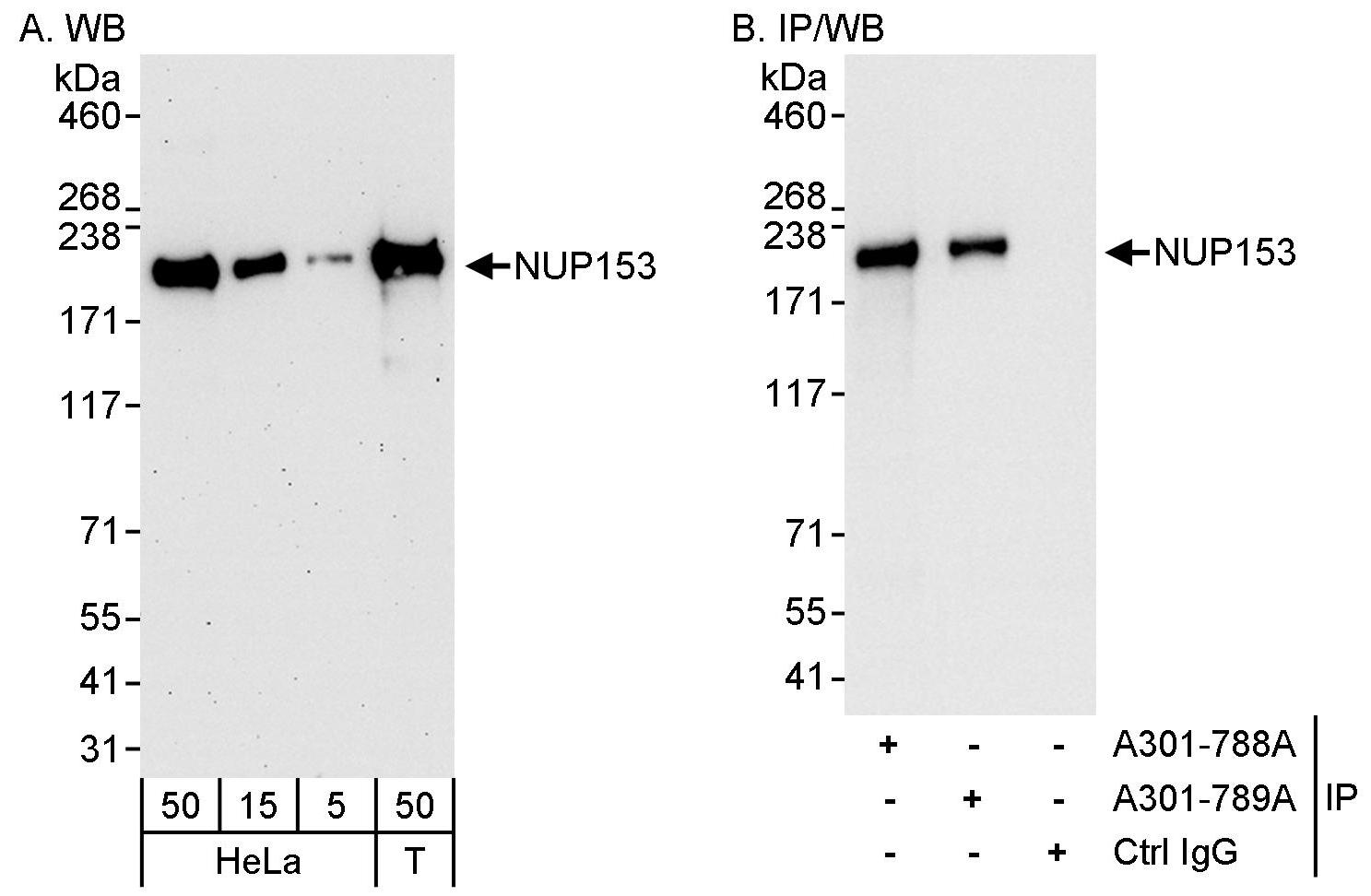 | Immunogen: | synthetic peptide. The epitope recognized by A301-788A-T maps to a region between residue 50 and 100 of human nucleoporin 153kDa using the numbering given in entry NP_005115.2 (GeneID 9972). |