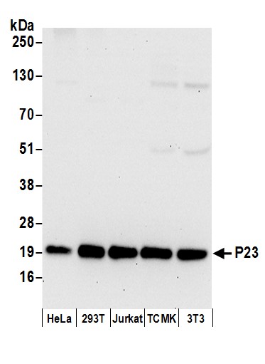 Immunogen: synthetic peptide. The epitope recognized by A304-499A-T maps to a region between residue 110 to 160 of human Progesterone Receptor Complex p23 using the numbering given in entry NP_006592.3 (GeneID 10728).