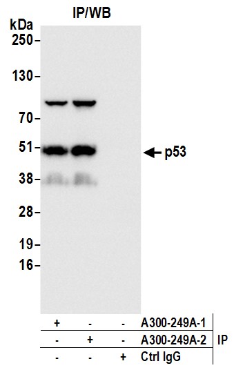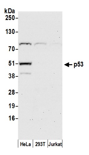 Immunogen: synthetic peptide. The epitope recognized by A300-249A-T maps to a region between residues 375 and the C-terminus (residue 393) of human tumor protein p53 using the numbering given in SwissProt entry P04637 (GeneID 7157).