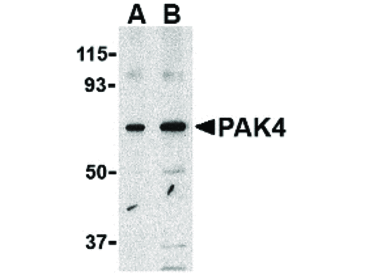 Anti-PAK4 Antibody was affinity purified from monospecific antiserum by immunoaffinity chromatography. Cross reactivity with PAK4 from other sources has not been determined. Protein function: Serine/threonine protein kinase that plays a role in a variety of different signaling pathways including cytoskeleton regulation, cell migration, growth, proliferation or cell survival. Activation by various effectors including growth factor receptors or active CDC42 and RAC1 results in a conformational change and a subsequent autophosphorylation on several serine and/or threonine residues. Phosphorylates and inactivates the protein phosphatase SSH1, leading to increased inhibitory phosphorylation of the actin binding/depolymerizing factor cofilin. Decreased cofilin activity may lead to stabilization of actin filaments. Phosphorylates LIMK1, a kinase that also inhibits the activity of cofilin. Phosphorylates integrin beta5/ITGB5 and thus regulates cell motility. Phosphorylates ARHGEF2 and activates the downstream target RHOA that plays a role in the regulation of assembly of focal adhesions and actin stress fibers. Stimulates cell survival by phosphorylating the BCL2 antagonist of cell death BAD. Alternatively, inhibits apoptosis by preventing caspase-8 binding to death domain receptors in a kinase independent manner. Plays a role in cell-cycle progression by controlling levels of the cell-cycle regulatory protein CDKN1A and by phosphorylating RAN. [The UniProt Consortium]