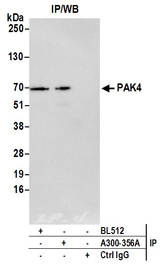 | Immunogen: | synthetic peptide. The epitope recognized by A300-356A-T maps to a region between residue 25 and 75 of human p21-Activated Kinase 4 using the numbering given in entry NP_005875.1 (GeneID 10298). |