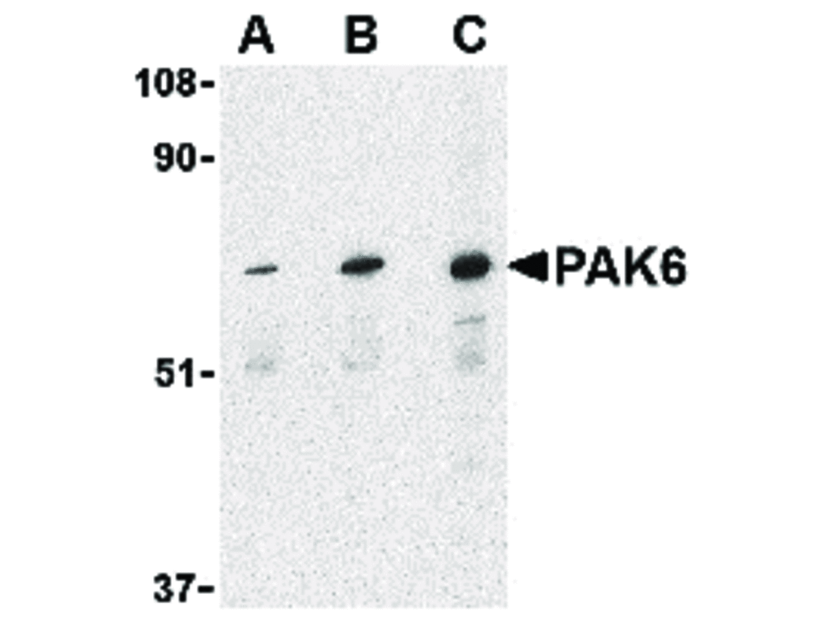 Anti-PAK6 Antibody was affinity purified from monospecific antiserum by immunoaffinity chromatography. Cross reactivity with PAK6 from other sources has not been determined. Protein function: Serine/threonine protein kinase that plays a role in the regulation of gene transcription. The kinase activity is induced by various effectors including AR or MAP2K6/MAPKK6. Phosphorylates the DNA-binding domain of androgen receptor/AR and thereby inhibits AR-mediated transcription. Inhibits also ESR1-mediated transcription. May play a role in cytoskeleton regulation by interacting with IQGAP1. May protect cells from apoptosis through phosphorylation of BAD. [The UniProt Consortium]
