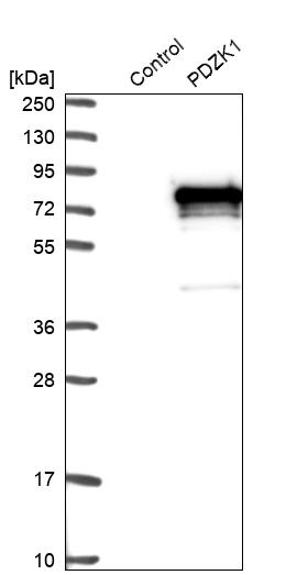 Protein function: A scaffold protein that connects plasma membrane proteins and regulatory components, regulating their surface expression in epithelial cells apical domains. May be involved in the coordination of a diverse range of regulatory processes for ion transport and second messenger cascades. In complex with SLC9A3R1, may cluster proteins that are functionally dependent in a mutual fashion and modulate the trafficking and the activity of the associated membrane proteins. May play a role in the cellular mechanisms associated with multidrug resistance through its interaction with ABCC2 and PDZK1IP1. May potentiate the CFTR chloride channel activity. Required for normal cell-surface expression of SCARB1. Plays a role in maintaining normal plasma cholesterol levels via its effects on SCARB1. Plays a role in the normal localization and function of the chloride-anion exchanger SLC26A6 to the plasma membrane in the brush border of the proximal tubule of the kidney. May be involved in the regulation of proximal tubular Na(+)-dependent inorganic phosphate cotransport therefore playing an important role in tubule function. [The UniProt Consortium] Buffer: 40% glycerol and PBS (pH 7.2). 0.02% sodium azide is added as preservative. Highest antigen sequence identity to mouse: 85% and to rat: 85%