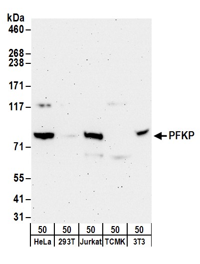 | Immunogen: | synthetic peptide. The epitope recognized by A304-283A-T maps to a region between residue 1 to 50 of human Phosphofructokinase, Platelet using the numbering given in entry NP_002618.1 (GeneID 5214). |