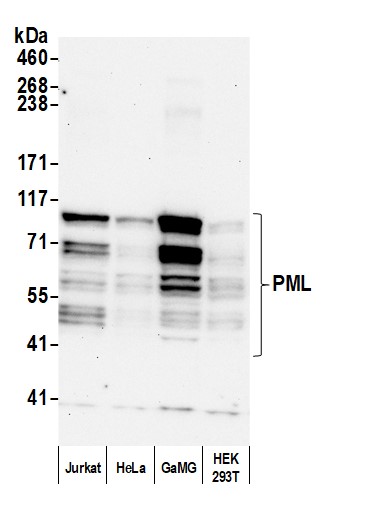 | Immunogen: | synthetic peptide. The epitope recognized by A301-167A-T maps to a region between residue 375 and 425 of promyelocytic leukemia using the numbering given in entry NP_150241.2 (GeneID 5371). |