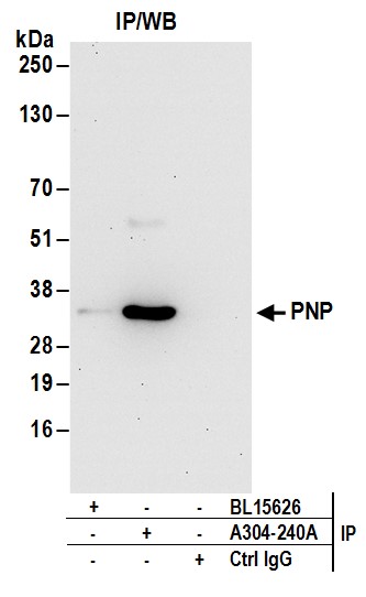 | Immunogen: | synthetic peptide. The epitope recognized by A304-240A-T maps to a region between residue 239 to 289 of human Purine Nucleoside Phosphorylase using the numbering given in entry NP_000261.2 (GeneID 4860). |