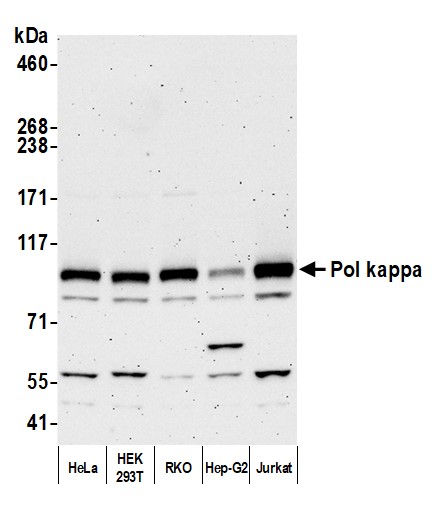 | Immunogen: | synthetic peptide. The epitope recognized by A301-977A-T maps to a region between residue 825 and 870 of human DNA polymerase kappa using the numbering given in entry NP_057302.1 (GeneID 51426). |
