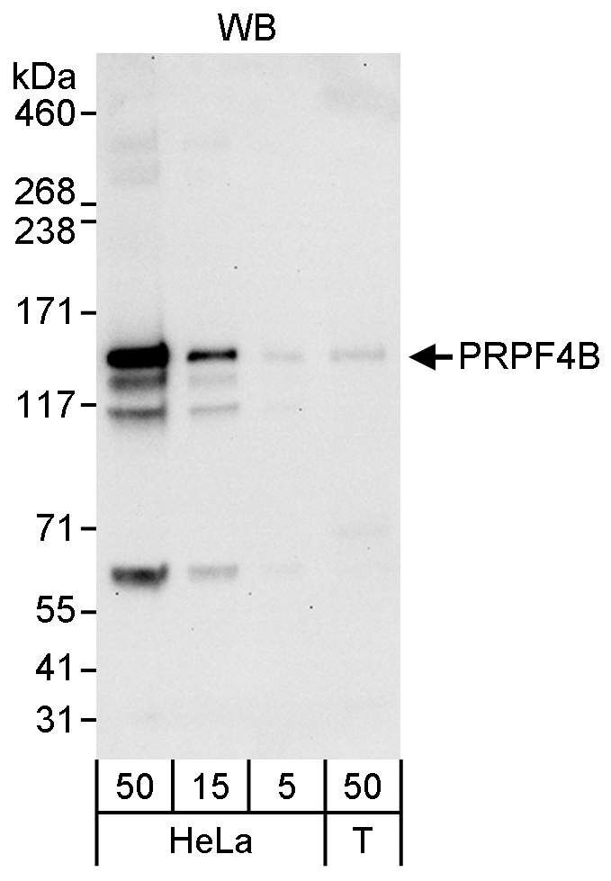 | Immunogen: | synthetic peptide. The epitope recognized by A301-665A-T maps to a region between residue 1 and 50 of human PRP4 pre-mRNA processing factor 4 homolog B using the numbering given in entry NP_003904.3 (GeneID 8899). |