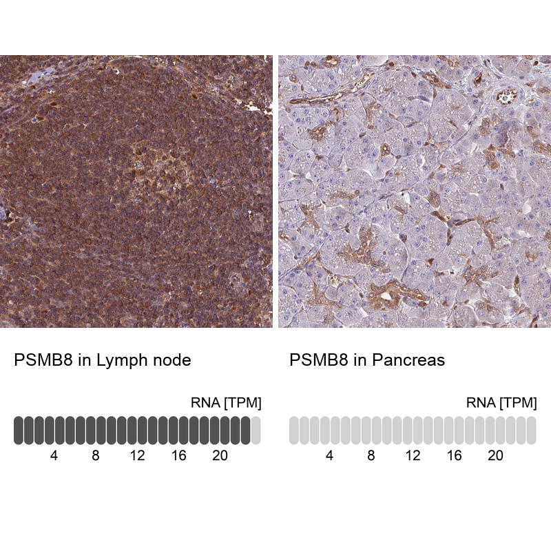 Protein function: The proteasome is a multicatalytic proteinase complex which is characterized by its ability to cleave peptides with Arg, Phe, Tyr, Leu, and Glu adjacent to the leaving group at neutral or slightly basic pH. The proteasome has an ATP-dependent proteolytic activity. This subunit is involved in antigen processing to generate class I binding peptides. Replacement of PSMB5 by PSMB8 increases the capacity of the immunoproteasome to cleave model peptides after hydrophobic and basic residues. Involved in the generation of spliced peptides resulting from the ligation of two separate proteasomal cleavage products that are not contiguous in the parental protein (PubMed:27049119). Acts as a major component of interferon gamma-induced sensitivity. Plays a key role in apoptosis via the degradation of the apoptotic inhibitor MCL1. May be involved in the inflammatory response pathway. In cancer cells, substitution of isoform 1 (E2) by isoform 2 (E1) results in immunoproteasome deficiency. Required for the differentiation of preadipocytes into adipocytes. [The UniProt Consortium] Buffer: 40% glycerol and PBS (pH 7.2). 0.02% sodium azide is added as preservative. Highest antigen sequence identity to mouse: 82% and to rat: 88%