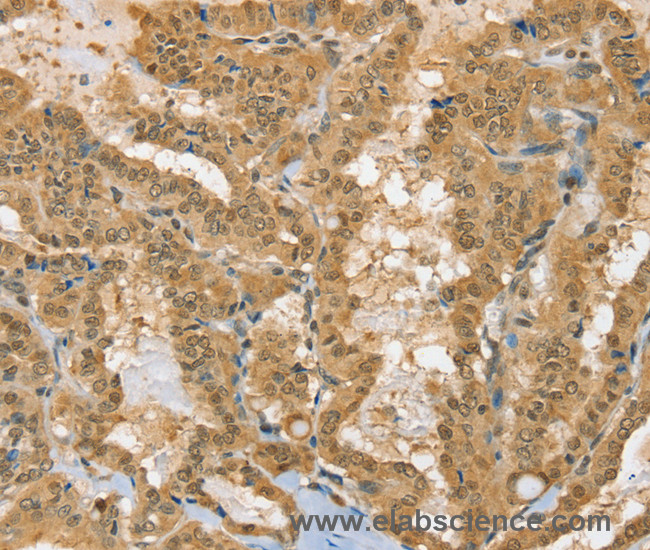 The 26S proteasome is a multicatalytic proteinase complex with a highly ordered structure composed of 2 complexes, a 20S core and a 19S regulator. The 20S core is composed of 4 rings of 28 non-identical subunits, 2 rings are composed of 7 alpha subunits and 2 rings are composed of 7 beta subunits. The 19S regulator is composed of a base, which contains 6 ATPase subunits and 2 non-ATPase subunits, and a lid, which contains up to 10 non-ATPase subunits. Protein function: Component of the 26S proteasome, a multiprotein complex involved in the ATP-dependent degradation of ubiquitinated proteins. This complex plays a key role in the maintenance of protein homeostasis by removing misfolded or damaged proteins, which could impair cellular functions, and by removing proteins whose functions are no longer required. Therefore, the proteasome participates in numerous cellular processes, including cell cycle progression, apoptosis, or DNA damage repair. PSMC1 belongs to the heterohexameric ring of AAA (ATPases associated with diverse cellular activities) proteins that unfolds ubiquitinated target proteins that are concurrently translocated into a proteolytic chamber and degraded into peptides. [The UniProt Consortium]