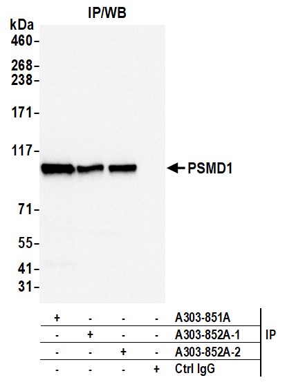 | Immunogen: | synthetic peptide. The epitope recognized by A303-852A-T maps to a region between residue 903 and 953 of human Proteasome (Prosome, Macropain) 26S Subunit, non-ATPase, 1 using the numbering given in entry NP_002798.2 (GeneID 5707). |