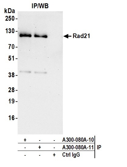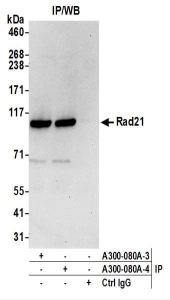 | Immunogen: | synthetic peptide. The epitope recognized by A300-080A-T maps to a region between residue 575 and the C-terminus (residue 631) of human Rad21 homolog using the numbering given in entry NP_006256.1 (GeneID 5885). |