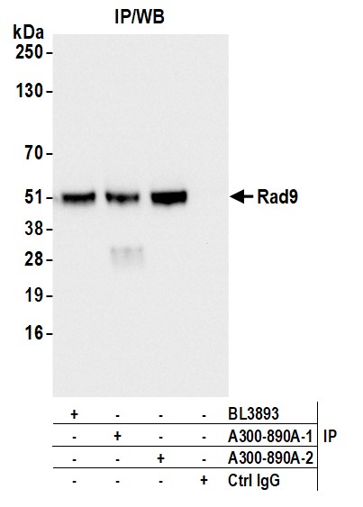 | Immunogen: | synthetic peptide. The epitope recognized by A300-890A-T maps to a region between residue 350 and the C-terminus (residue 391) of human Rad9 using the numbering given in entry NP_004575.1 (GeneID 5883). |