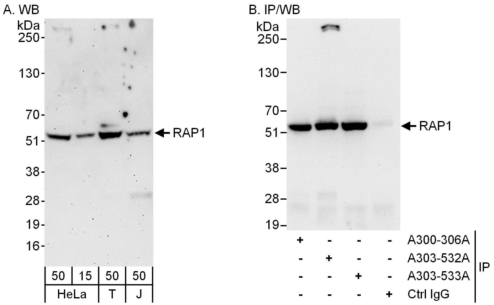 | Immunogen: | synthetic peptide. The epitope recognized by A303-532A-T maps to a region between residue 100 and 150 of human Repressor/Activator Protein 1 using the numbering given in entry NP_061848.2 (GeneID 54386). |