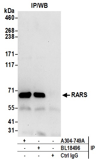 | Immunogen: | synthetic peptide. The epitope recognized by A304-749A-T maps to a region between residue 1 to 50 of human Arginyal-tRNA Synthetase using the numbering given in entry NP_002878.2 (GeneID 5917). |