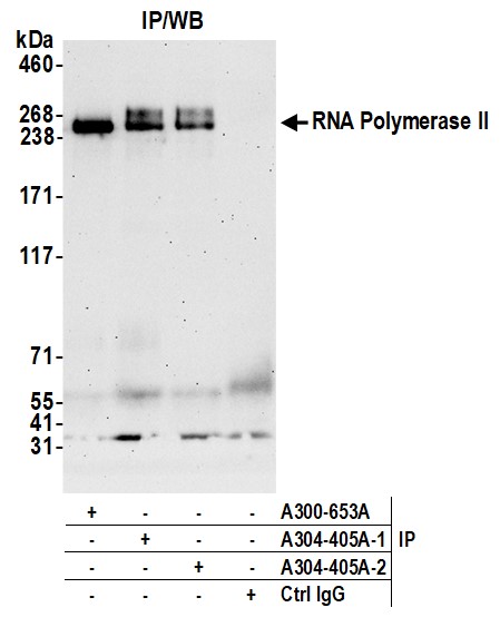 | Immunogen: | synthetic peptide. The epitope recognized by A304-405A-T maps to a region between residue 754 to 804 of human RNA Polymerase II using the numbering given in entry NP_000928.1 (GeneID 5430). |