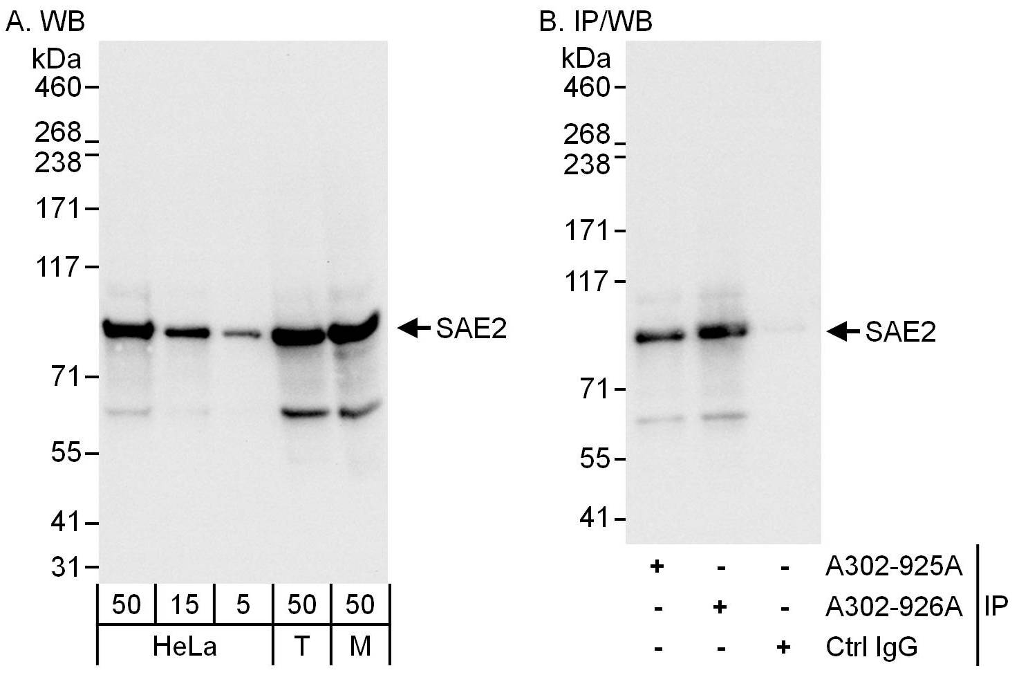 | Immunogen: | synthetic peptide. The epitope recognized by A302-926A-T maps to a region between residue 590 and 640 of human SUMO1 Activating Enzyme Subunit 2 using the numbering given in entry NP_005490.1 (GeneID 10054). |
