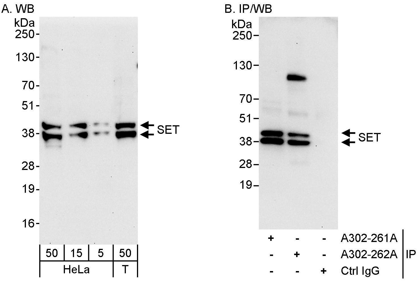 | Immunogen: | synthetic peptide. The epitope recognized by A302-262A-T maps to a region between residue 175 and 225 of human SET nuclear oncogene using the numbering given in entry NP_001116293.1 (GeneID 6418). |