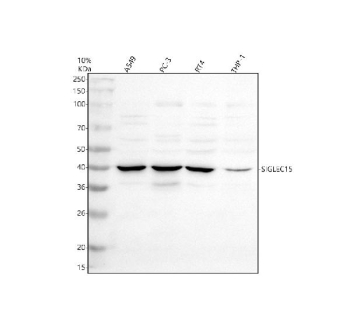 Adding 0.2 ml of distilled water will yield a concentration of 500 ug/ml. SIGLEC15 antibody recognizes Sialic acid-binding Ig-like lectin 15, a type I transmembrane protein belonging to the Siglec (sialic acid-binding immunoglobulin-like lectins) family of immune modulators. SIGLEC15 plays an important role in immune regulation, osteoclast differentiation, and tumor immune evasion. It binds sialylated glycoconjugates on target cells, transmitting inhibitory or activating signals that shape immune responses. The SIGLEC15 antibody is widely used in immunology, oncology, and bone biology research to study checkpoint signaling and macrophage-mediated immune regulation.Sialic acid-binding Ig-like lectin 15 is encoded by the SIGLEC15 gene located on human chromosome 18q12.3. The protein consists of an extracellular N-terminal V-set immunoglobulin domain that recognizes sialylated glycans, a transmembrane segment, and a short cytoplasmic tail that associates with adaptor proteins such as DAP12 or DAP10 to mediate downstream signaling. In osteoclasts, SIGLEC15 promotes differentiation and bone resorption by activating phosphoinositide 3-kinase and mitogen-activated protein kinase cascades. In immune cells, it functions as a checkpoint ligand that suppresses T-cell activation, analogous to PD-L1.Studies using the SIGLEC15 antibody have shown that this protein is upregulated on tumor-associated macrophages and osteoclasts in various malignancies and inflammatory diseases. Western blot analyses typically detect a 35-40 kilodalton glycoprotein band. Immunohistochemistry demonstrates strong membrane staining in macrophage-rich regions of tumors and in bone-resorptive zones. Functionally, SIGLEC15 acts as an immune suppressor by binding unidentified receptors on T cells and natural killer cells, inhibiting cytokine production and cytotoxic responses. Its expression inversely correlates with PD-L1, suggesting a complementary role in immune evasion mechanisms exploited by tumors.Therapeutic targeting of SIGLEC15 has emerged as a promising strategy in cancer immunotherapy, particularly for patients unresponsive to PD-1/PD-L1 blockade. The protein also regulates osteoclast activity and bone remodeling, making it relevant in osteoporosis and arthritis research. NSJ Bioreagents provides a validated SIGLEC15 antibody optimized for western blot, flow cytometry, and immunohistochemistry. This reagent enables researchers to investigate innate immune regulation, tumor microenvironment biology, and checkpoint-based immunotherapy development.