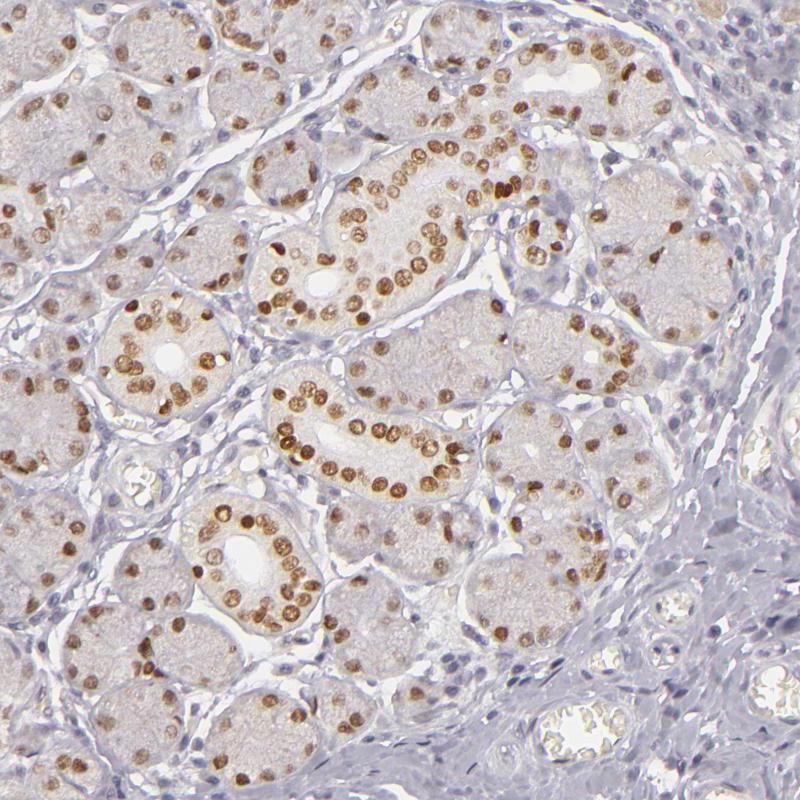 Protein function: Transcription factor that is involved in the regulation of cell proliferation, apoptosis and embryonic development. Plays an important role in the development of several organs, including kidney, muscle and inner ear. Depending on context, functions as transcriptional repressor or activator. Lacks an activation domain, and requires interaction with EYA family members for transcription activation (PubMed:15141091). Mediates nuclear translocation of EYA1 and EYA2 (PubMed:19497856). Binds the 5'-TCA[AG][AG]TTNC-3' motif present in the MEF3 element in the MYOG promoter and CIDEA enhancer (PubMed:27923061, PubMed:23435380, PubMed:15141091, PubMed:19497856). Regulates the expression of numerous genes, including MYC, CCND1 and EZR. Acts as activator of the IGFBP5 promoter, probably coactivated by EYA2. Repression of precursor cell proliferation in myoblasts is switched to activation through recruitment of EYA3 to the SIX1-DACH1 complex. During myogenesis, seems to act together with EYA2 and DACH2. Regulates the expression of CCNA1 (PubMed:15123840). Promotes brown adipocyte differentiation. [The UniProt Consortium] Buffer: 40% glycerol and PBS (pH 7.2). 0.02% sodium azide is added as preservative. Highest antigen sequence identity to mouse: 99% and to rat: 99%