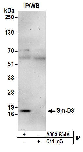 | Immunogen: | synthetic peptide. The epitope recognized by A303-954A-T maps to a region between residue 76 to 126 of human Small Nuclear Ribonucleoprotein D3 Polypeptide 18kDa using the numbering given in entry NP_004166.1 (GeneID 6634). |