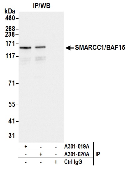 | Immunogen: | synthetic peptide. The epitope recognized by A301-020A-T maps to a region between residue 750 and 800 of human SMARCC1/BAF155 using the numbering given in entry NP_003065.2 (GeneID 6599). |
