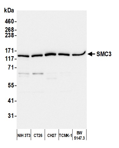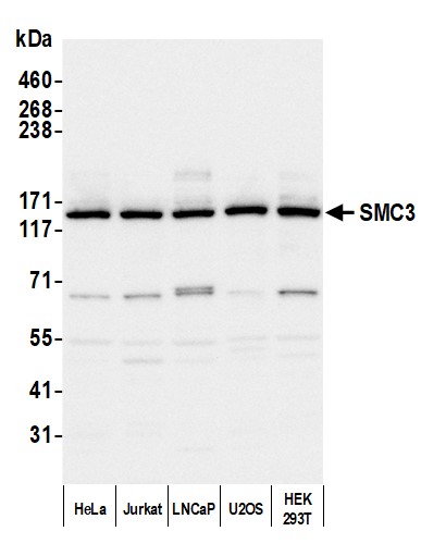 | Immunogen: | synthetic peptide. The epitope recognized by A300-060A-T maps to a region between residue 1175 and the C-terminus (residue 1217) of human Structural Maintenance of Chromosomes 3 using the numbering given in entry NP_005436.1 (GeneID 9126). |