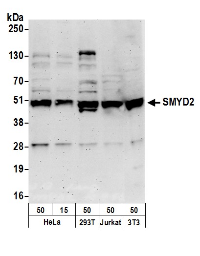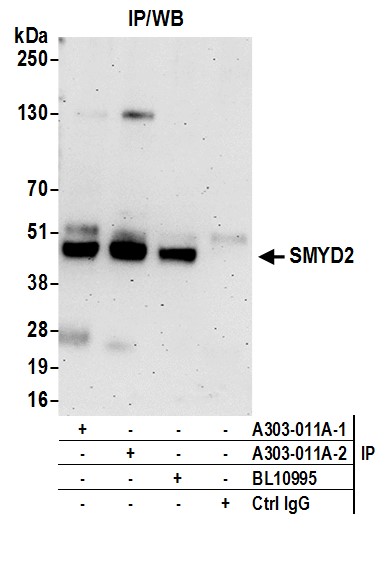 | Immunogen: | synthetic peptide. The epitope recognized by A303-011A-T maps to a region between residue 383 and 433 of human SET and MYND Domain Containing 2 using the numbering given in entry NP_064582.2 (GeneID 56950). |