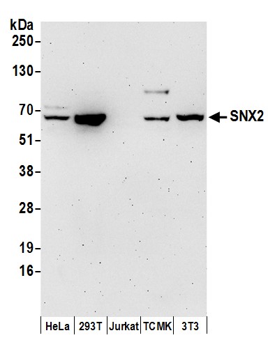 | Immunogen: | synthetic peptide. The epitope recognized by A304-544A-T maps to a region between residue 1 to 50 of human Sorting Nexin 2 using the numbering given in entry NP_003091.2 (GeneID 6643). |