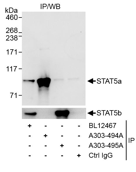 | Immunogen: | synthetic peptide. The epitope recognized by A303-494A-T maps to a region between residue 744 and 794 of human Signal Transducer and Activator of Transcription 5A using the numbering given in entry NP_003143.2 (GeneID 6776). |