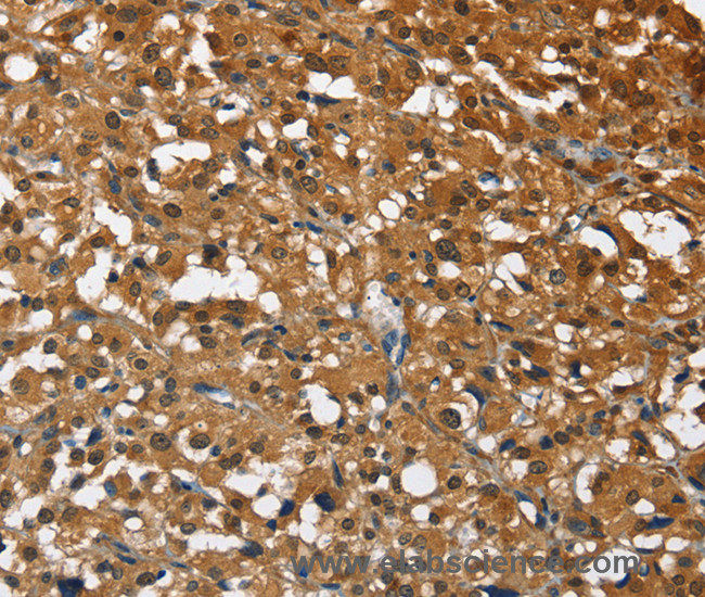 The full-length STK17B cDNA clone encodes a deduced 372-amino acid protein with a molecular mass of 42.34 kD. The putative kinase domain is located at the N terminus and contains all 11 subdomains conserved among ser/thr kinases. STK17A and STK17B share 59.7% amino acid identity. Northern blot analysis revealed that STK17B was expressed in various tissues, such as heart, placenta, liver, and pancreas, as different-sized transcripts, presumably due to differences in the 3-prime untranslated region. Transient transfection of COS-7 cells showed that STK17B localized in nuclei. Phosphorylates myosin light chains. Acts as a positive regulator of apoptosis. Protein function: Phosphorylates myosin light chains. Acts as a positive regulator of apoptosis. [The UniProt Consortium]