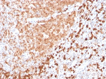 Prediluted in 1X PBS with 0.1 mg/ml BSA (US sourced) and 0.05% sodium azide, *For IHC use only*. T-cell leukemia/Lymphoma Protein 1A (TCL-1A), also known as p14TCL1 is a product of the TCL1 gene that is involved in T-cell prolymphocytic leukemia (TPLL). T-PLL is a rare form of mature T-cell leukemia, which is consistently associated with chromosomal rearrangements characterized by the juxtaposition of the TCRA locus on chromosome 14q11 and the TCL1A gene on 14q32.13. TCL1 is overexpressed in Burkitt lymphoma, the majority of AIDS-related non-Hodgkin lymphoma-designated immunoblastic plasmacytoid lymphoma, lymphoblastic lymphoma, chronic lymphocytic leukemia, mantle cell lymphoma, follicular lymphoma, diffuse large B-cell lymphoma, and primary cutaneous B-cell lymphoma. Protein function: Enhances the phosphorylation and activation of AKT1, AKT2 and AKT3. Promotes nuclear translocation of AKT1. Enhances cell proliferation, stabilizes mitochondrial membrane potential and promotes cell survival. [The UniProt Consortium]