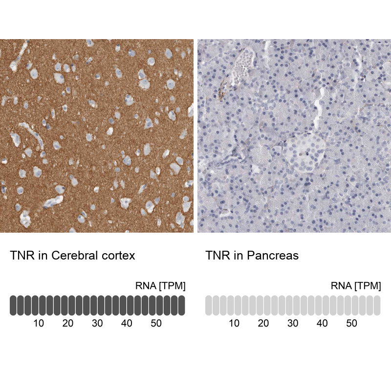 Protein function: Neural extracellular matrix (ECM) protein involved in interactions with different cells and matrix components. These interactions can influence cellular behavior by either evoking a stable adhesion and differentiation, or repulsion and inhibition of neurite growth. Binding to cell surface gangliosides inhibits RGD-dependent integrin-mediated cell adhesion and results in an inhibition of PTK2/FAK1 (FAK) phosphorylation and cell detachment. Binding to membrane surface sulfatides results in a oligodendrocyte adhesion and differentiation. Interaction with CNTN1 induces a repulsion of neurons and an inhibition of neurite outgrowth. Interacts with SCN2B may play a crucial role in clustering and regulation of activity of sodium channels at nodes of Ranvier. TNR-linked chondroitin sulfate glycosaminoglycans are involved in the interaction with FN1 and mediate inhibition of cell adhesion and neurite outgrowth. The highly regulated addition of sulfated carbohydrate structure may modulate the adhesive properties of TNR over the course of development and during synapse maintenance. [The UniProt Consortium] Buffer: 40% glycerol and PBS (pH 7.2). 0.02% sodium azide is added as preservative. Highest antigen sequence identity to mouse: 99% and to rat: 97%