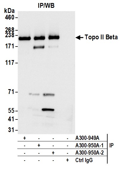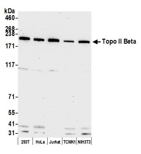 Immunogen: synthetic peptide. The epitope recognized by A300-950A-T maps to a region between residue 1475 and 1525 of human DNA Topoisomerase II Beta using the numbering given in entry NP_001059.2 (GeneID 7155).