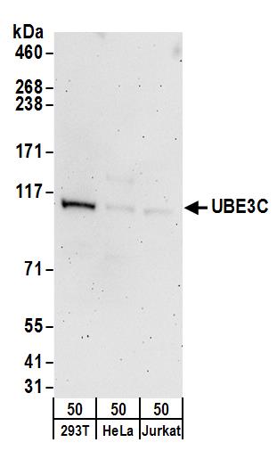 | Immunogen: | synthetic peptide. The epitope recognized by A304-122A-T maps to a region between residue 350 to 400 of human Ubiquitin Protein Ligase E3C using the numbering given in entry NP_055486.2 (GeneID 9690). |
