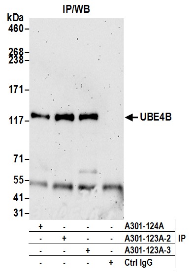 | Immunogen: | synthetic peptide. The epitope recognized by A301-123A-T maps to a region between residue 125 and 175 of human ubiquitination factor E4B using the numbering given in entry AAD02233.1 (GeneID 10277). |