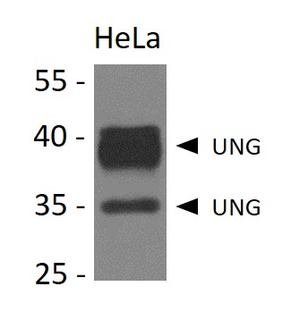 | Immunogen: | Recombinant fusion protein corresponding to aa. 1-313 of Human UNG (NP_550433.1) |