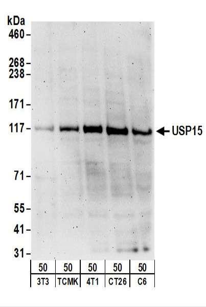 | Immunogen: | synthetic peptide. The epitope recognized by A300-923A-T maps to a region between residue 960 and the C-terminus of human Ubiquitin Specific Peptidase 15 using the numbering given in entry AAD41086.1 (GeneID 9958). |