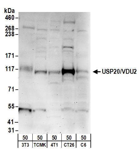 | Immunogen: | synthetic peptide. The epitope recognized by A301-189A-T maps to a region between residue 863 and 913 of human ubiquitin specific peptidase 20 (pVHL-interacting deubiquitinating enzyme 2) using the numbering given in entry NP_006667.2 (GeneID 10868). |