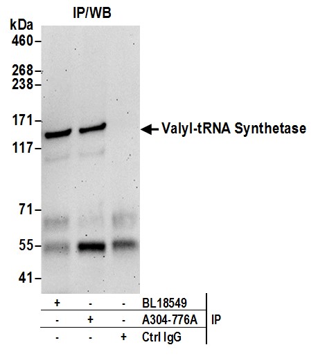 | Immunogen: | synthetic peptide. The epitope recognized by A304-776A-T maps to a region between residue 1214 to 1264 of human Valyl-tRNA synthetase using the numbering given in entry P26640.4 (GeneID 7407). |