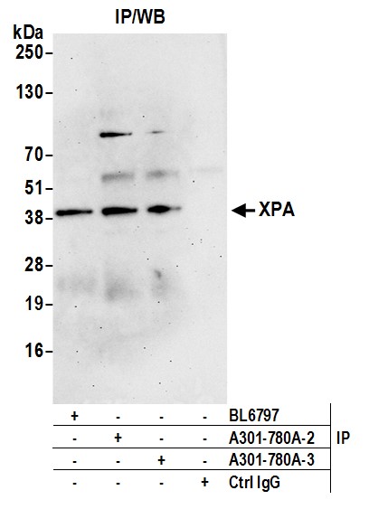 | Immunogen: | synthetic peptide. The epitope recognized by A301-780A-T maps to a region between residue 1 and 50 of human xeroderma pigmentosum, complementation group A using the numbering given in entry NP_000371.1 (GeneID 7507). |