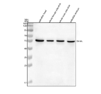 0.5mg/ml if reconstituted with 0.2ml sterile DI water. Zebrafish Shha, also known as sonic hedgehog a, is a signaling molecule that plays a critical role in embryonic development, pattern formation, and cell differentiation. Shha belongs to the hedgehog family of secreted proteins that regulate key developmental pathways, including neural tube patterning, somite organization, and craniofacial morphogenesis. It is particularly important for the proper formation of the central nervous system, muscle segmentation, and the shaping of the midline structures during early development.Zebrafish Shha is an ortholog of the human sonic hedgehog (SHH) protein and shares a high level of sequence and functional conservation. Like human SHH, zebrafish Shha undergoes proteolytic processing and lipid modification to produce an active signaling molecule that interacts with the Patched receptor and initiates downstream signaling through the Smoothened and Gli transcription factors. This pathway regulates the expression of numerous target genes that influence cell fate and tissue organization.There are no known isoforms of zebrafish Shha, but zebrafish possess another related hedgehog gene called Shhb, which shares overlapping but distinct roles during development. The combination of Shha and Shhb activity helps orchestrate the complex patterning events required for normal embryogenesis.Antibodies against zebrafish Shha protein are valuable tools for studying hedgehog signaling pathways, developmental biology, and tissue patterning. These antibodies can be applied in techniques such as western blot, immunohistochemistry, immunofluorescence, and ELISA to monitor Shha expression and localization in embryonic tissues.