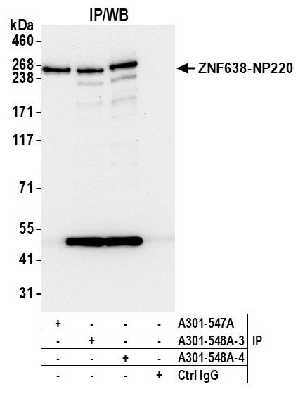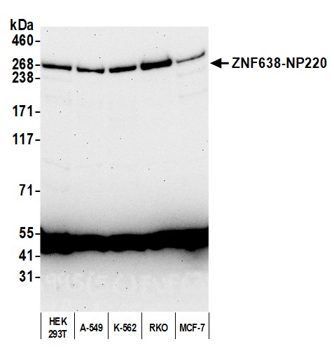 | Immunogen: | synthetic peptide. The epitope recognized by A301-548A-T maps to a region between residue 1928 and 1978 of human zinc finger protein 638 (Nuclear protein 220) using the numbering given in entry NP_055312.2 (GeneID 27332). |