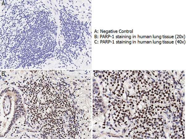 | Immunogen: | n-terminus region of human PARP1 zinc finger domain recombinant protein. Anti-Rabbit IgG HRP secondary antibody was produced by repeated immunizations with Rabbit IgG whole molecule. |