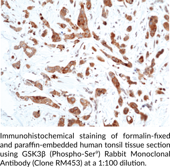 Glycogen synthase kinase 3beta (GSK3beta) is a serine/threonine protein kinase that has roles in numerous signaling pathways and cellular processes, including cell proliferation and survival, as well as neural development and plasticity. It is composed of an N-terminal beta-strand domain, a kinase domain, and a C-terminal alpha-helical domain. GSK3beta is constitutively active, ubiquitously expressed, and localizes predominantly to the cytosol but is also found in the nucleus and mitochondria. It is inhibited by phosphorylation at serine 9 (Ser9), which is mediated by a variety of kinases, including PKA and Akt, and has roles in insulin, growth factor, and Wnt signaling pathways. GSK3beta is involved in several pathophysiological conditions, such as diabetes, cancer, inflammation, and neurological or psychiatric disorders, including Alzheimer's disease, Parkinson's disease, and bipolar disorder. Cayman's GSK3beta (Phospho-Ser9) Rabbit Monoclonal Antibody (Clone RM453) can be used for immunohistochemistry (IHC) and Western blot (WB) applications.. Cross reactivity: (+) GSK3beta (phospho-Ser9): (-) Non-phosphorylated GSK3beta. (+) Human: (+) Mouse, (+) Rat.. Protein function: Constitutively active protein kinase that acts as a negative regulator in the hormonal control of glucose homeostasis, Wnt signaling and regulation of transcription factors and microtubules, by phosphorylating and inactivating glycogen synthase (GYS1 or GYS2), EIF2B, CTNNB1/beta-catenin, APC, AXIN1, DPYSL2/CRMP2, JUN, NFATC1/NFATC, MAPT/TAU and MACF1. Requires primed phosphorylation of the majority of its substrates. In skeletal muscle, contributes to insulin regulation of glycogen synthesis by phosphorylating and inhibiting GYS1 activity and hence glycogen synthesis. May also mediate the development of insulin resistance by regulating activation of transcription factors. Regulates protein synthesis by controlling the activity of initiation factor 2B (EIF2BE/EIF2B5) in the same manner as glycogen synthase. In Wnt signaling, GSK3B forms a multimeric complex with APC, AXIN1 and CTNNB1/beta-catenin and phosphorylates the N- terminus of CTNNB1 leading to its degradation mediated by ubiquitin/proteasomes. Phosphorylates JUN at sites proximal to its DNA- binding domain, thereby reducing its affinity for DNA. Phosphorylates NFATC1/NFATC on conserved serine residues promoting NFATC1/NFATC nuclear export, shutting off NFATC1/NFATC gene regulation, and thereby opposing the action of calcineurin. Phosphorylates MAPT/TAU on 'Thr- 548', decreasing significantly MAPT/TAU ability to bind and stabilize microtubules. MAPT/TAU is the principal component of neurofibrillary tangles in Alzheimer disease. Plays an important role in ERBB2- dependent stabilization of microtubules at the cell cortex. Phosphorylates MACF1, inhibiting its binding to microtubules which is critical for its role in bulge stem cell migration and skin wound repair. Probably regulates NF-kappa-B (NFKB1) at the transcriptional level and is required for the NF-kappa-B-mediated anti-apoptotic response to TNF-alpha (TNF/TNFA). Negatively regulates replication in pancreatic beta-cells, resulting in apoptosis, loss of beta-cells and diabetes. Through phosphorylation of the anti-apoptotic protein MCL1, may control cell apoptosis in response to growth factors deprivation. Phosphorylates MUC1 in breast cancer cells, decreasing the interaction of MUC1 with CTNNB1/beta-catenin. Is necessary for the establishment of neuronal polarity and axon outgrowth. Phosphorylates MARK2, leading to inhibit its activity. Phosphorylates SIK1 at 'Thr-182', leading to sustain its activity. Phosphorylates ZC3HAV1 which enhances its antiviral activity. Phosphorylates SNAI1, leading to its BTRC-triggered ubiquitination and proteasomal degradation. Phosphorylates SFPQ at 'Thr-687' upon T-cell activation. Phosphorylates NR1D1 st 'Ser-55' and 'Ser-59' and stabilizes it by protecting it from proteasomal degradation. Regulates the circadian clock via phosphorylation of the major clock components including ARNTL/BMAL1, CLOCK and PER2 (PubMed:19946213, PubMed:28903391). Phosphorylates CLOCK AT 'Ser-427' and targets it for proteasomal degradation (PubMed:19946213). Phosphorylates ARNTL/BMAL1 at 'Ser-17' and 'Ser-21' and primes it for ubiquitination and proteasomal degradation (PubMed:28903391). Phosphorylates OGT at 'Ser-3' or 'Ser-4' which positively regulates its activity. Phosphorylates MYCN in neuroblastoma cells which may promote its degradation (PubMed:24391509). Regulates the circadian rhythmicity of hippocampal long-term potentiation and ARNTL/BMLA1 and PER2 expression. Acts as a regulator of autophagy by mediating phosphorylation of KAT5/TIP60 under starvation conditions, leading to activate KAT5/TIP60 acetyltransferase activity and promote acetylation of key autophagy regulators, such as ULK1 and RUBCNL/Pacer (PubMed:30704899). Negatively regulates extrinsic apoptotic signaling pathway via death domain receptors. Promotes the formation of an anti- apoptotic complex, made of DDX3X, BRIC2 and GSK3B, at death receptors, including TNFRSF10B. The anti-apoptotic function is most effective with weak apoptotic signals and can be overcome by stronger stimulation (PubMed:18846110). [The UniProt Consortium]