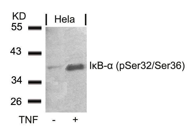 Keywords: Anti-phospho-IKBA, Anti-phospho-NFKBIA, Anti-phospho-IkB-alpha, Anti-phospho-IkappaBalpha, Anti-phospho-I-kappa-B-alpha, Anti-phospho-NF-kappa-B inhibitor alpha, Anti-phospho-Major histocompatibility complex enhancer-binding protein MAD3