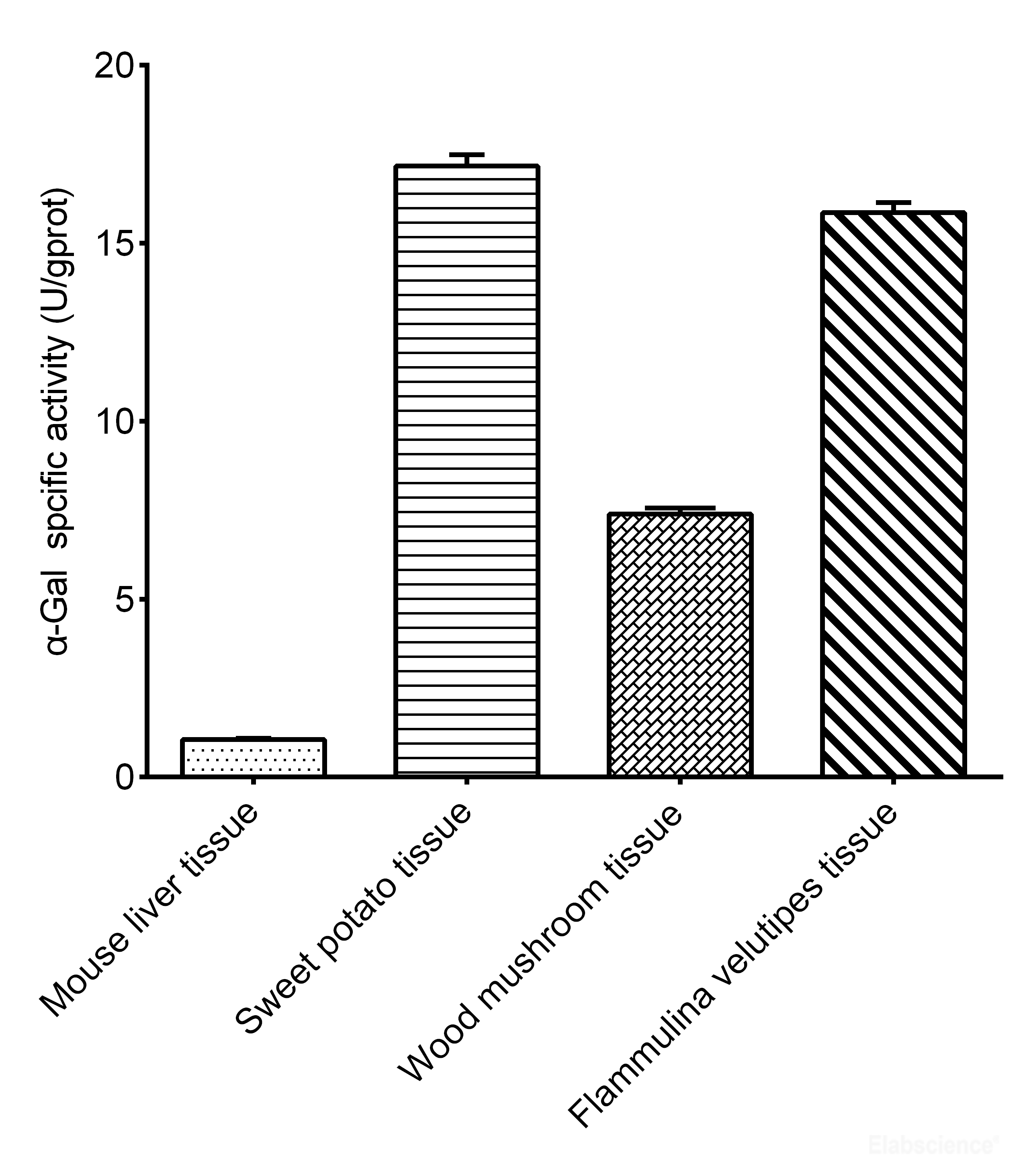 Detection principle: alpha-Galactosidase (alpha-Gal) catalyzes the substances produced in the glycolysis process of animal and plant tissues to form the final product, which has a maximum absorption peak at 405 nm. Performance characteristics: Sample type: animal tissue,plant tissue. Sensitivity: 0.02 U/L. Detection range: 0.02-29.06 U/L. Detection method: Colorimetric method. Assay type: Enzyme Activity. Assay time: 75 min. Precision: Average inter-assay. CV: 4.0-8.0%. Average intra-assay CV: 1.0-3.0%. Other reagents required: Double distilled water. Storage: -20?. Valid period: 12 months. Protein function: Catalyzes the hydrolysis of glycosphingolipids and participates in their degradation in the lysosome. [The UniProt Consortium]